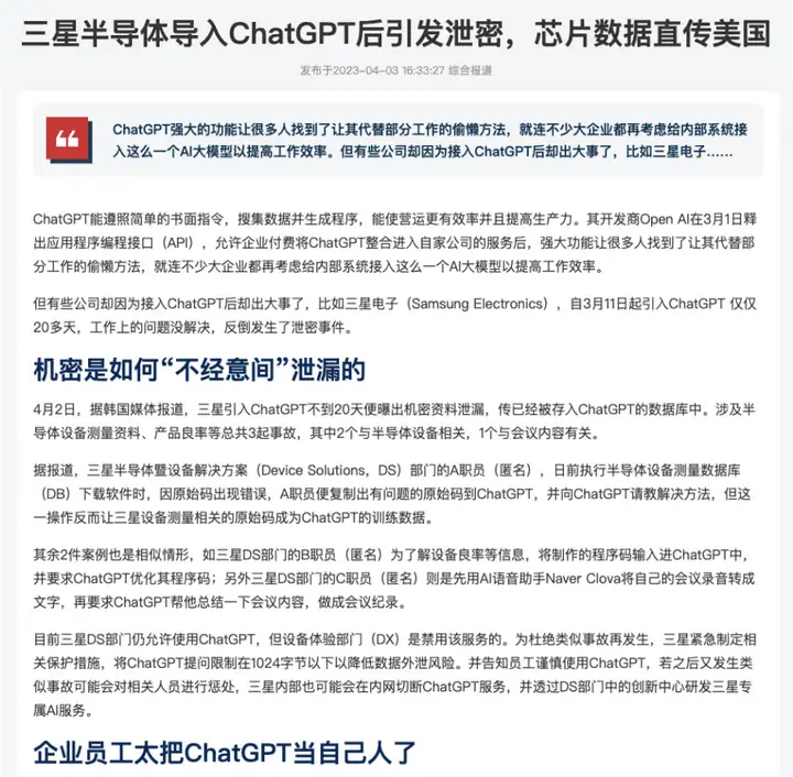 此前三星通报了公司内部严重的信息泄露事故:有员工将公司内部源码传至 ChatGPT 进行 Debug,还有传会议内容至 ChatGPT 制作会议记录。