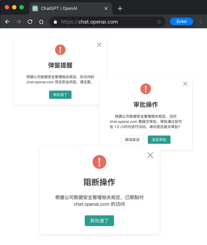 青骓 DDR 提供精准的数据流向监控与泄露防护响应功能,可有效管理 AI 应用的使用。根据企业办公安全标准,提供包括但不限于:审批后访问、弹窗警示、阻断访问在内的多种防护功能,对风险做好:事前及时提醒、事中发现响应、事后追踪溯源,灵活保障员工安全地使用 ChatGPT 等 AI 应用进行提效。