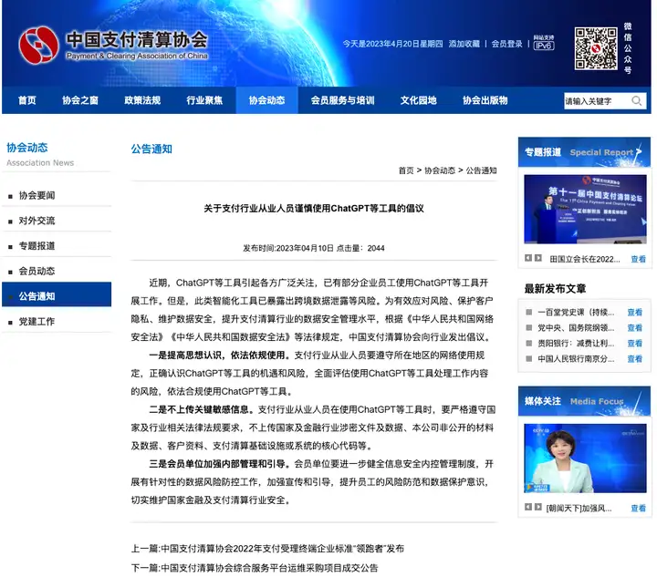 中国支付清算协会指出 ChatGPT 等工具已暴露跨境数据泄露风险,并发出倡议:金融行业员工要严格遵守国家及行业相关法律法规要求,不上传国家及金融行业涉密文件及数据、本公司非公开的材料及数据、客户资料、支付清算基础设施或系统的核心代码等。