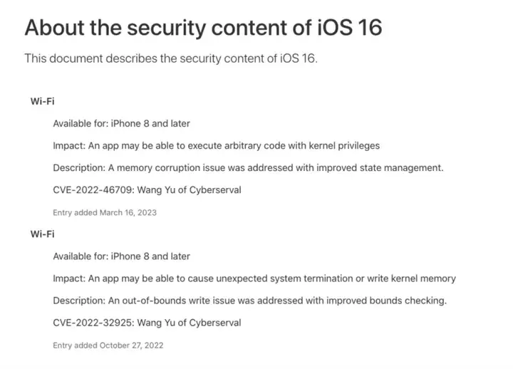 在 Wi-Fi 等领域继续挖呀挖~ 截至目前,薮猫科技已向安全社区贡献了两篇顶级安全会议议题,并持续协助苹果公司修复了包括:CVE-2020-9832, CVE-2020-9833, CVE-2020-9834, CVE-2020-9899, CVE-2020-10013, CVE-2022-26761, CVE-2022-26762, CVE-2022-32837, CVE-2022-32847, CVE-2022-32860, CVE-2022-32925, CVE-2022-46709 在内的众多内核高危漏洞。