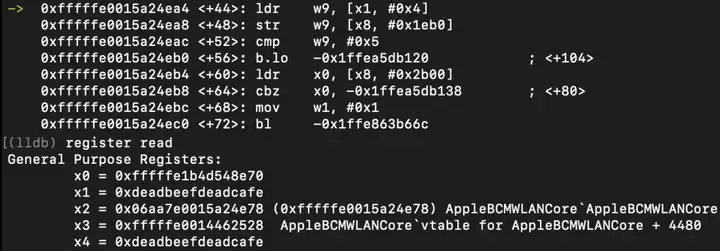 从攻防研究的角度看,CVE-2022-46709 属于危害最大的内核任意地址读写漏洞,其利用过程无需堆风水等复杂技巧辅助。通过构造一系列 Wi-Fi 输入参数,攻击者能够精准操控内核代码的执行流程。在拥有强大的任意地址读写原语之后,对关键内核数据结构的篡改会进一步导致执行权限的跃升。下图展示了在 Apple Silicon M2 平台,恶意代码对于 x1、x4 等寄存器的控制情况。