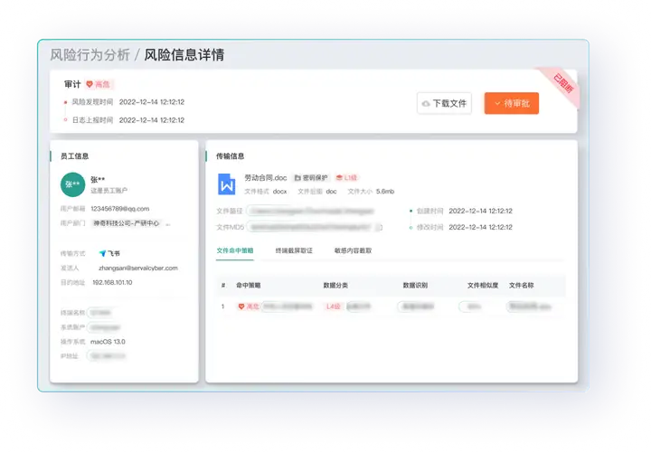 青骓 DDR 对员工外发的数据文件进行实时检测,通过审计记录、弹窗询问、弹窗提醒、阻断、审批等多响应动作配置,可实现不同员工的精准化管控。