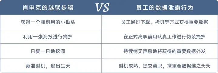 现在,回到企业数据安全场景,试想一下,假设有预离职员工想携企业重要数据来一场「肖申克式的越狱」,他/她会有哪些行动?