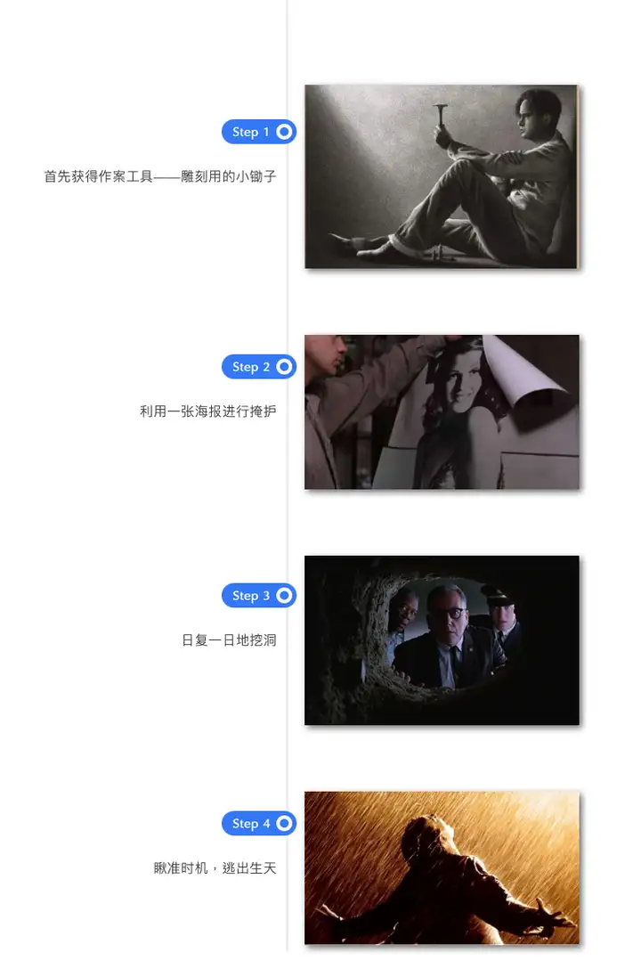 我们先来简单还原下肖申克主人公安迪的越狱步骤: