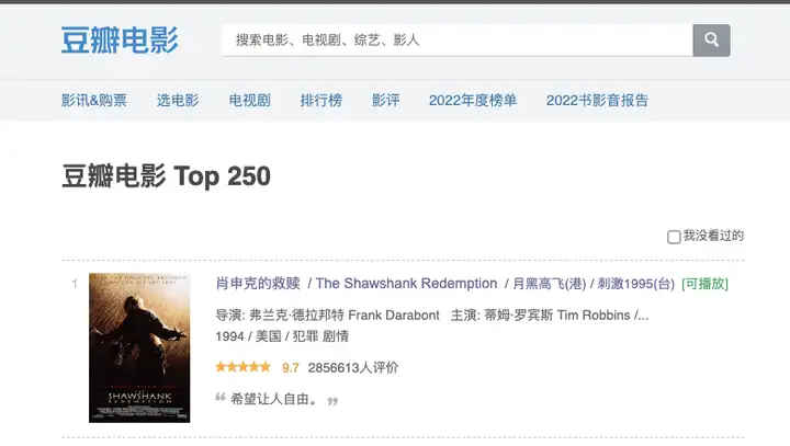 豆瓣电影 Top 250 的排行榜,《肖申克的救赎》已经稳居了多年的榜首。