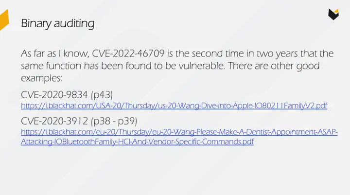 紧接着,从 Qualcomm Adreno、ARM Mali 到 Apple AGX 平台,历史经典安全问题依次登场,通过这些案例我们可以更好的理解 GPU 子系统实现层面那些不为人所熟知的细节。议题的最后部分,王宇还展示了最新版操作系统中 GPU 子系统的安全性问题。