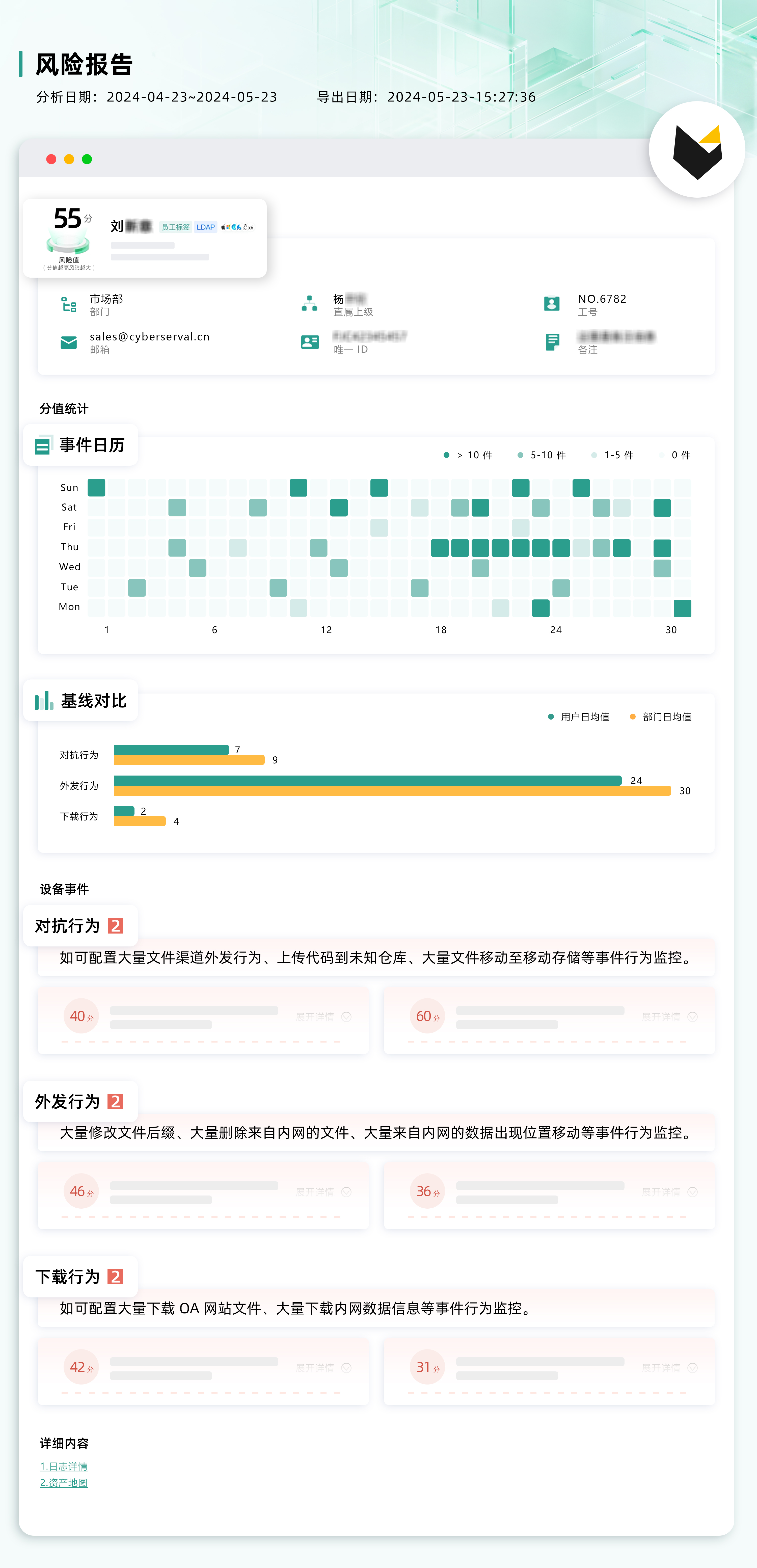 在最后的离职流程中,安全部门可以凭借近期的风险报告完成确认,简化了安全审查流程,提高了调查的效率和准确性。同时,帮助待离职员工简化自证流程,减少了不必要的猜疑和纠纷。