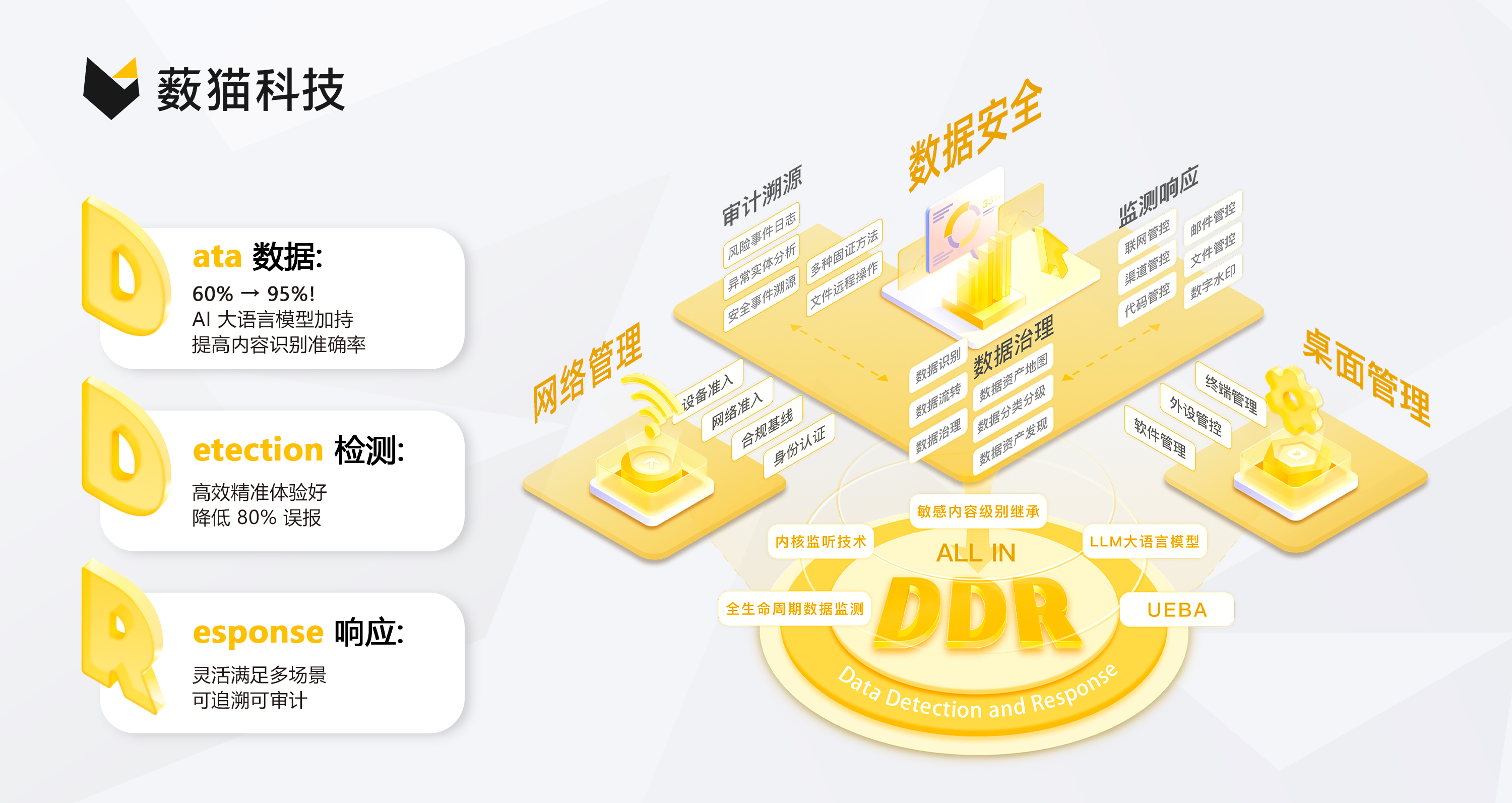 作为中国数据安全领域的创新型公司,薮猫科技自成立之初,便专注于数据安全领域,致力于提供动态、全局、综合的数据安全解决方案。其中,凭借团队出色的终端能力所打造的青骓 DDR 检测与响应产品,已成功获得了各行各业客户的认可。作为终端数据安全一体化管理的佼佼者,青骓 DDR 集数据防泄漏、网络准入控制和桌面安全管理于一体,实现了终端安全的全面监测与智能响应。在保障企业数据安全的同时,青骓 DDR 还能帮助管理者监控企业敏感数据的使用情况,确保其在企业内部的合规合理使用。