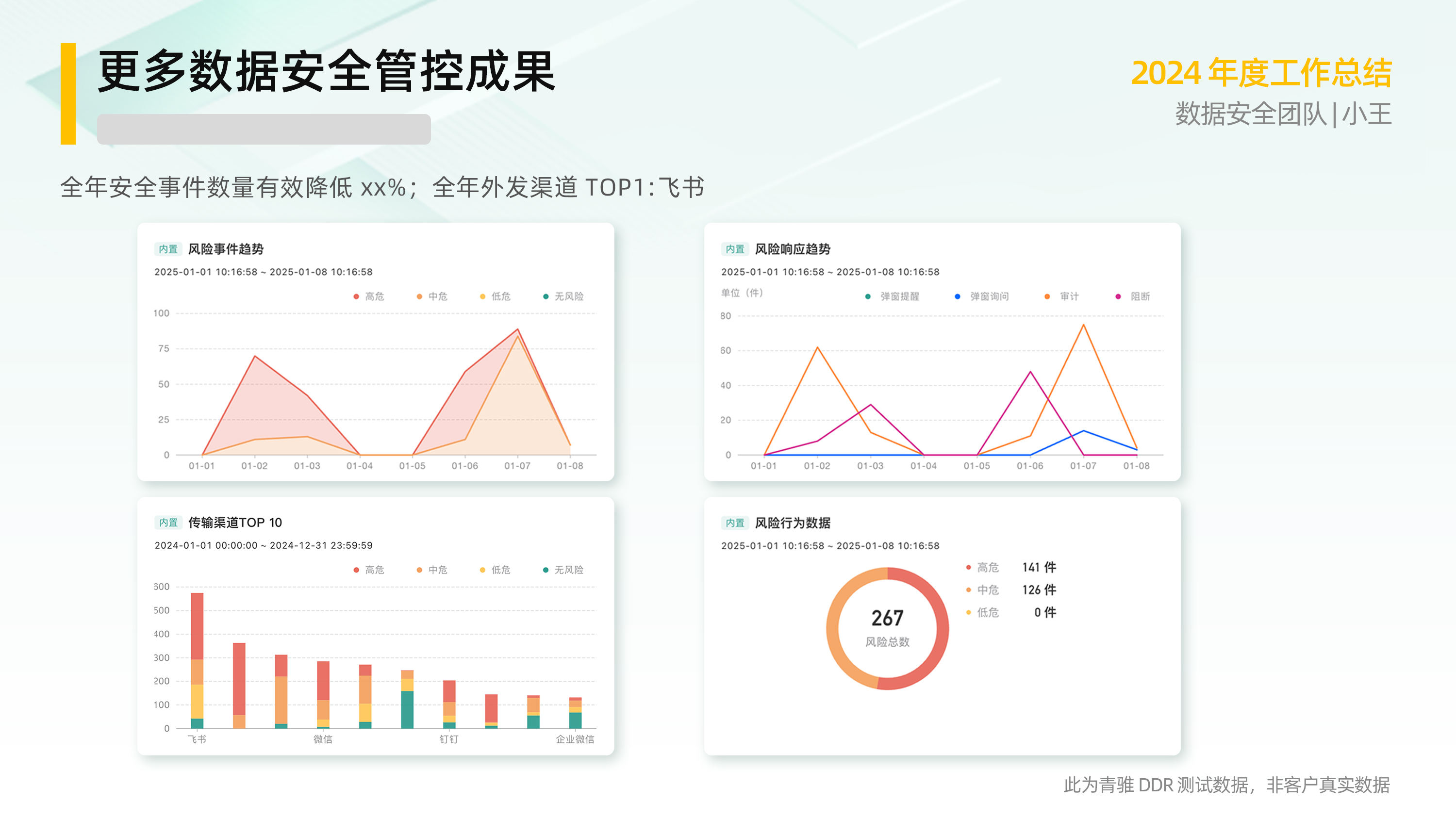 这些问题困扰着许多像小王一样的安全团队成员,而青骓 DDR 深入洞察安全部门的工作场景,凭借其简洁、可视化的功能,帮助数据安全团队轻松解决汇报难题,让年终总结更高效、精准。