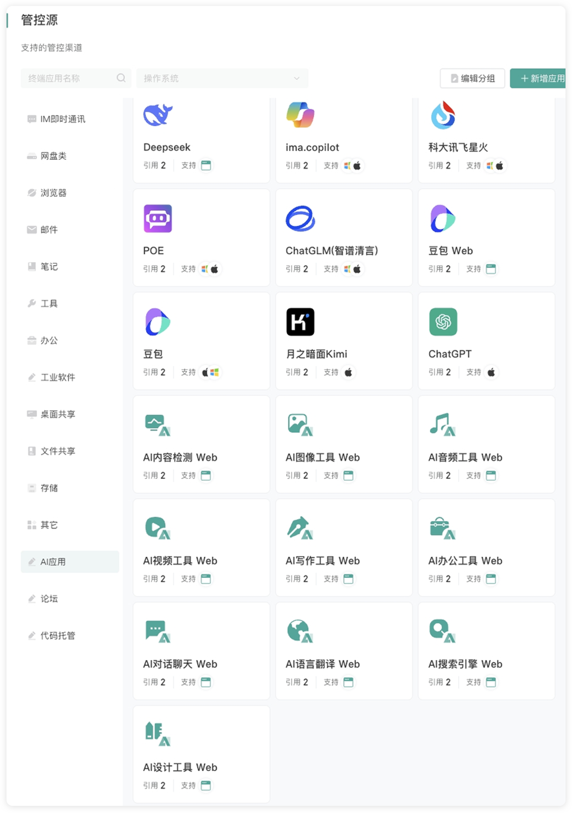 基本覆盖市场主流的 AI 应用,且支持用户新增应用