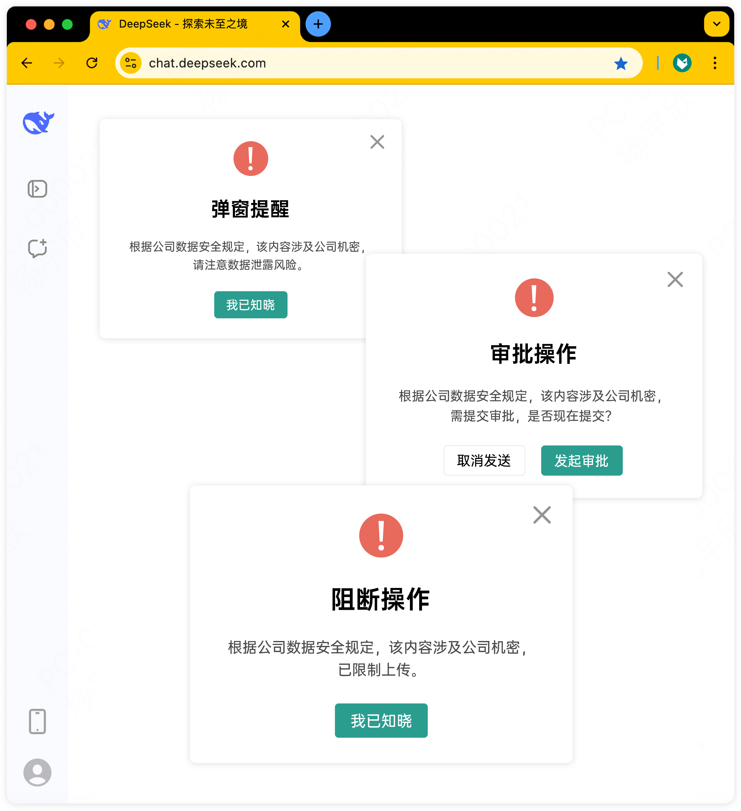 例如,当用户从机密文件中复制一段核心内容并尝试上传至 DeepSeek,系统将及时识别并进行对应的响应动作,确保敏感数据不经无意或恶意操作泄露。