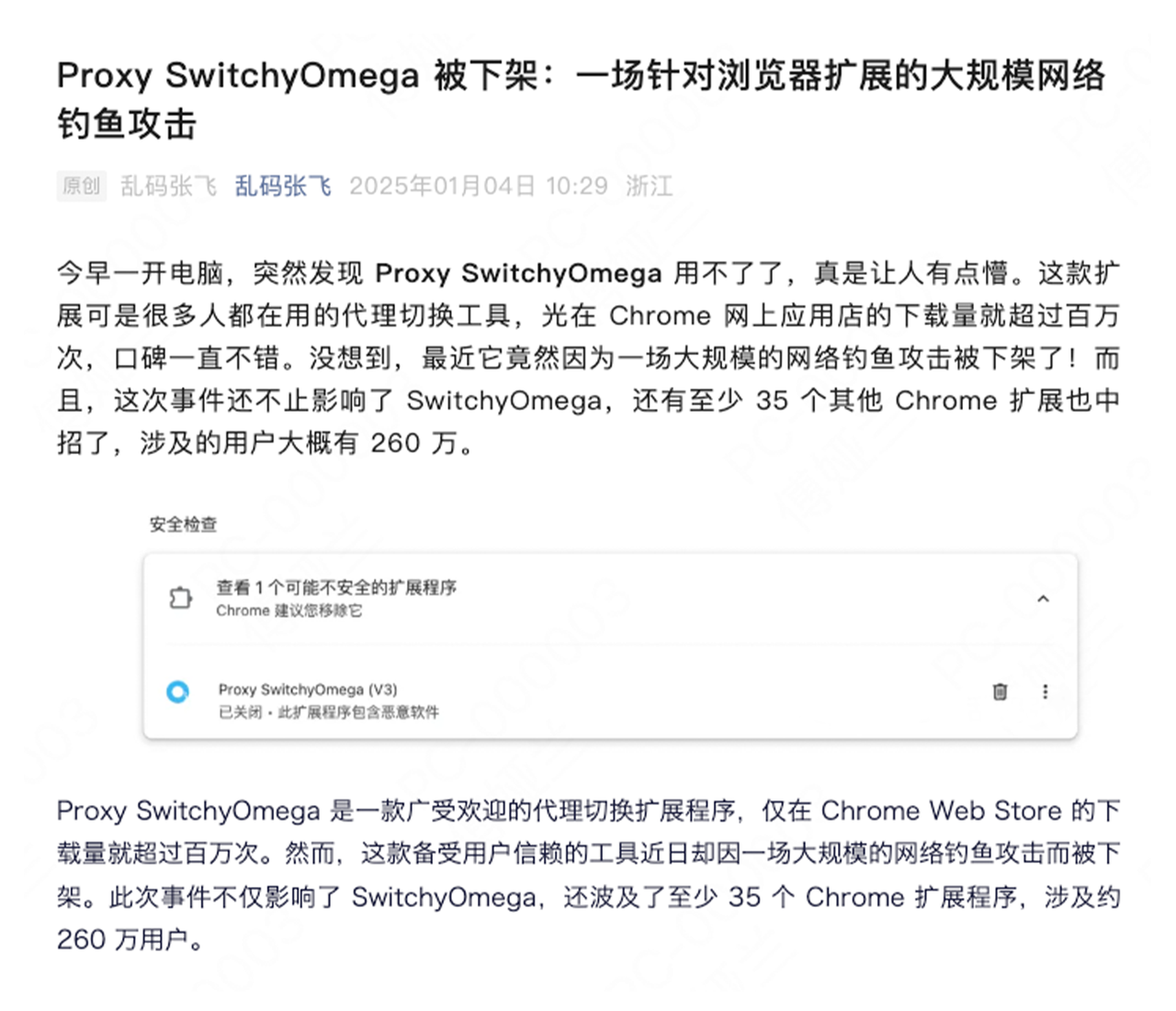比如 2024 年 Booz Allen Hamilton 报告曾指出,Chrome 应用商店已有超 30 款插件遭到污染,影响超过 260 万用户,其中就包括被大量技术人员使用的 Proxy SwitchOmega。