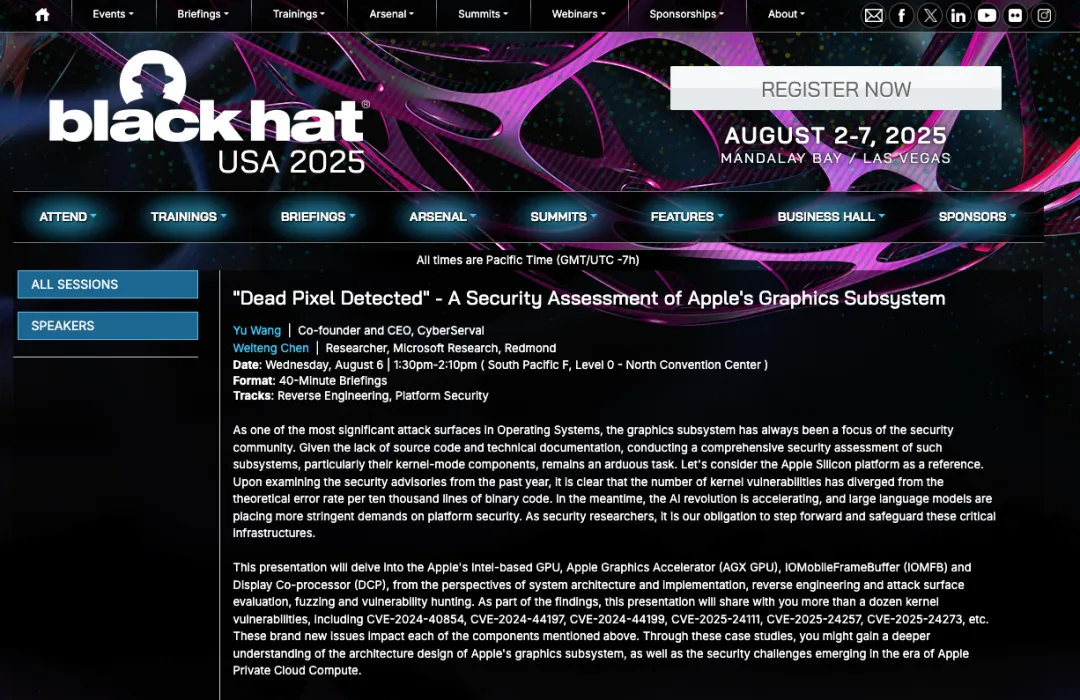 近日,全球瞩目的 Black Hat USA 2025 在拉斯维加斯圆满落幕。薮猫科技团队的最新研究成果 《Dead Pixel Detected: A Security Assessment of Apple’s Graphics Subsystem》 正式在主会场技术议题环节对外发布。