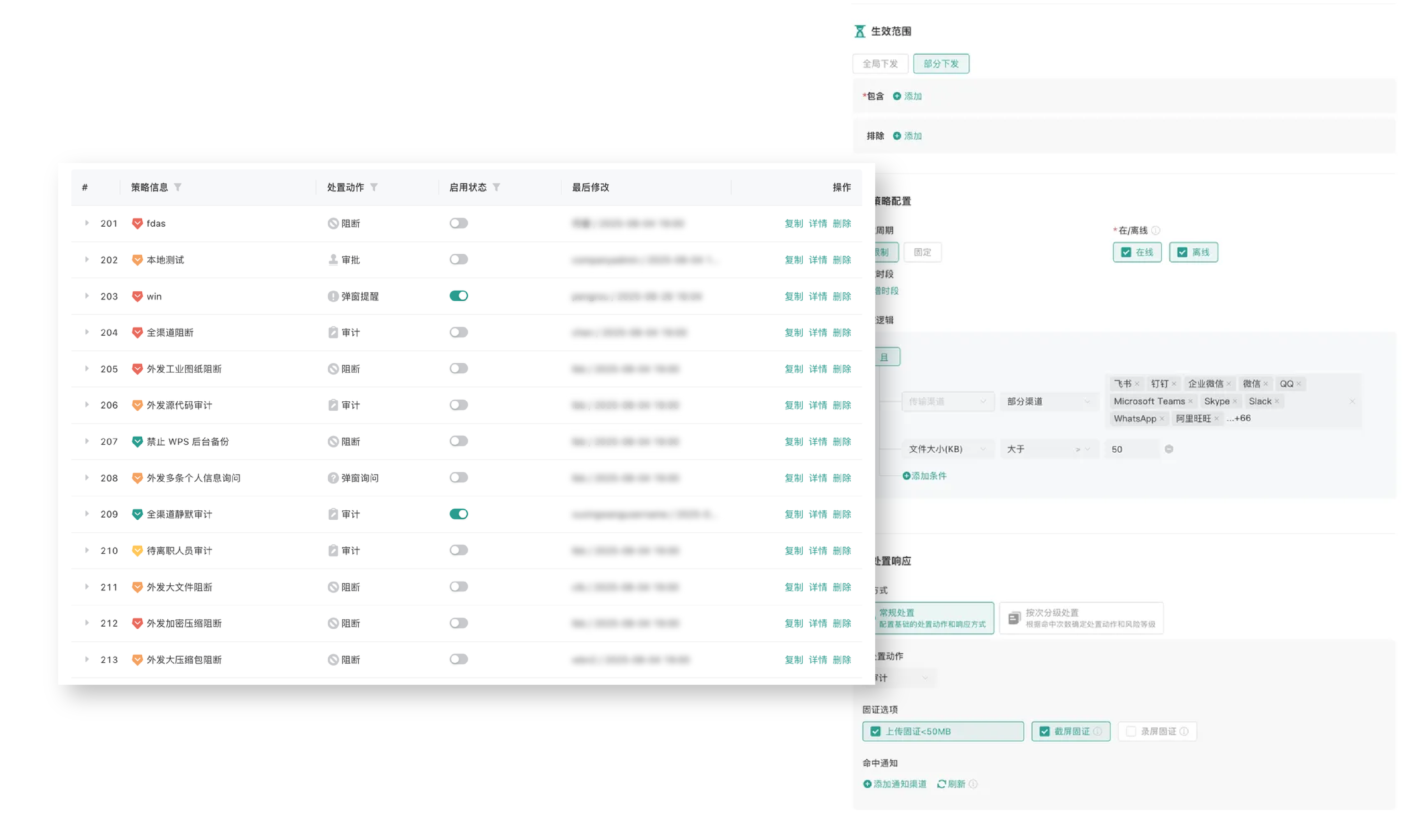 • 可调动作:发现违规数据是直接拦截,还是先预警,再人工审批?
